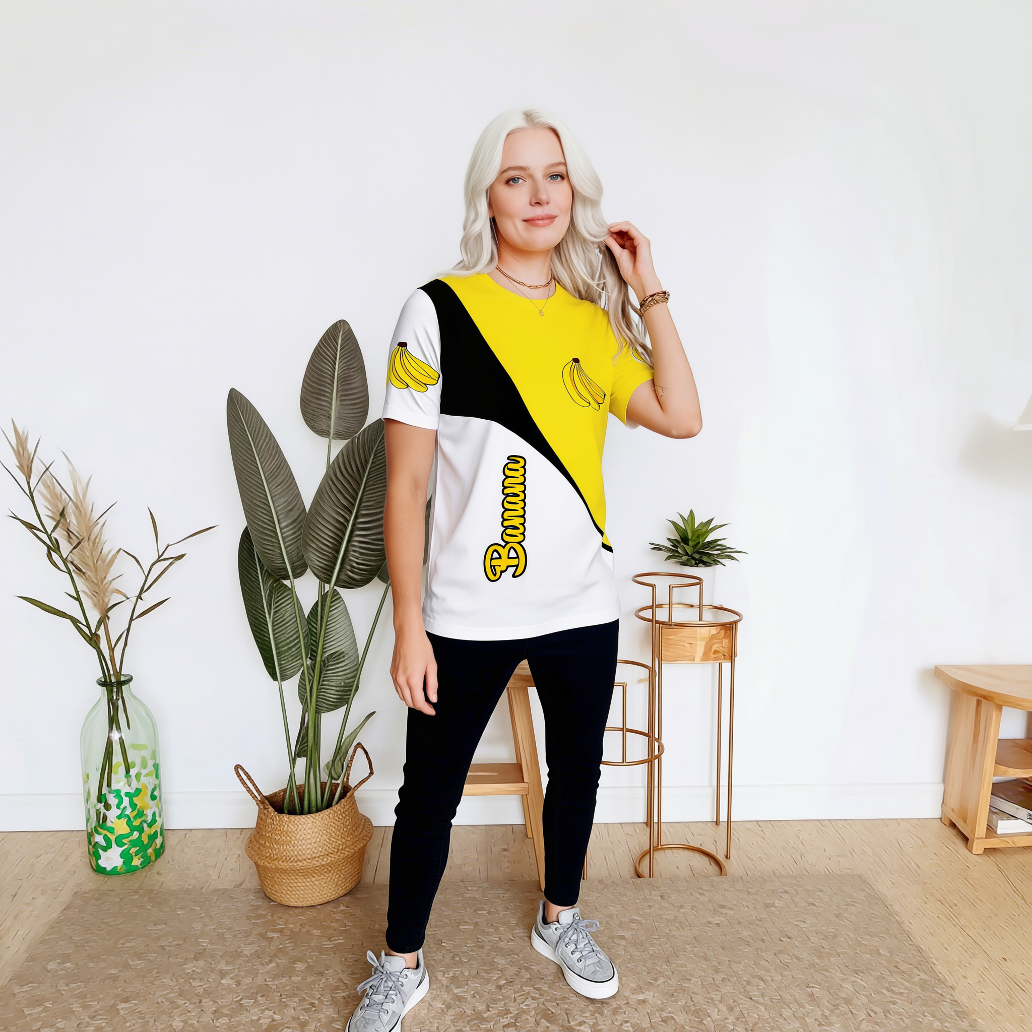 | Design | 3D graphic print with abstract curve pattern, banana graphics, and Banana script detail |