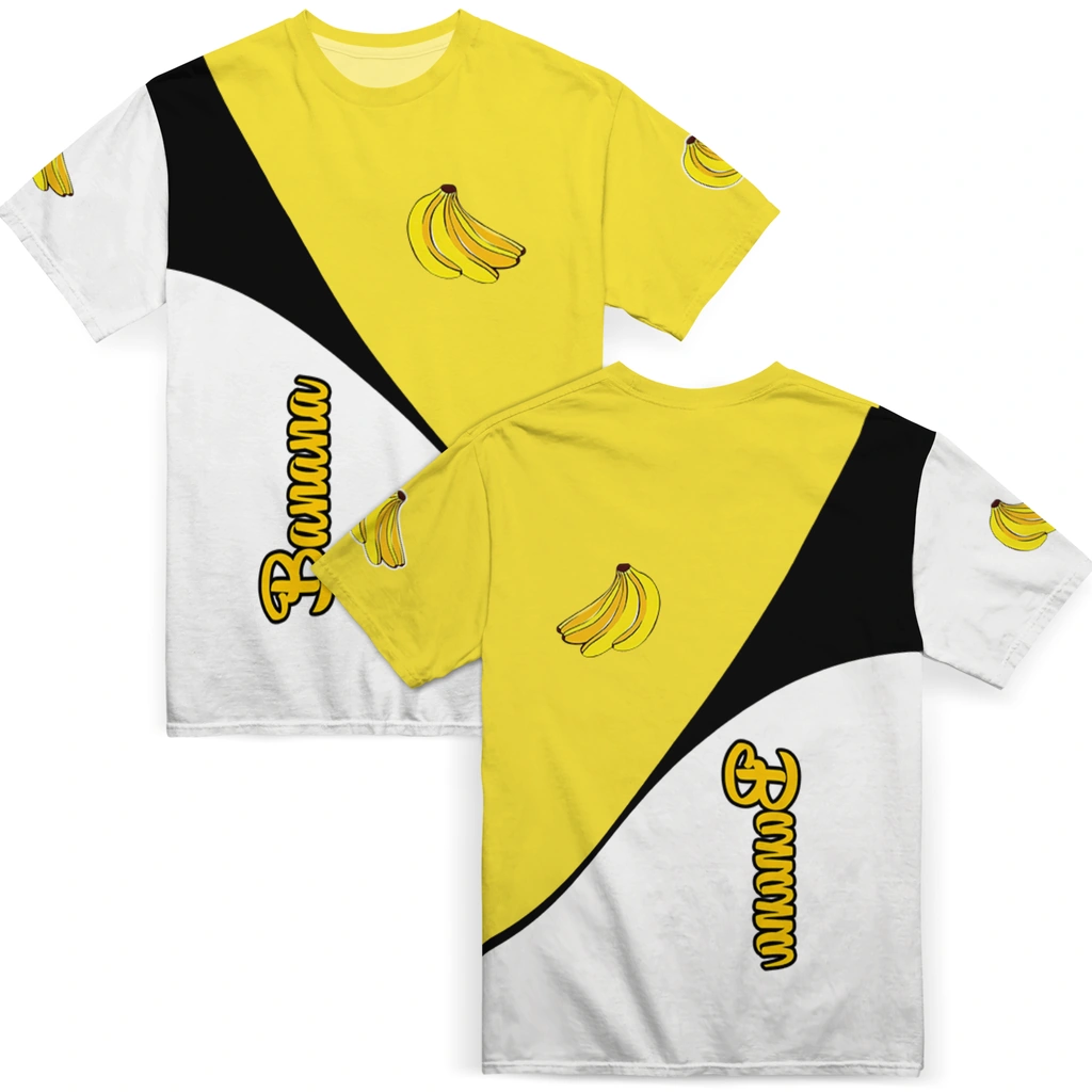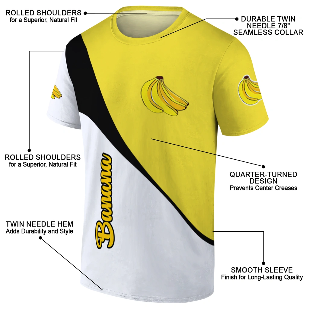 Banana Logo 3D Tshirt – Abstract Curve Yellow White featuring an abstract curve design with yellow, white, and black tones, along with banana graphics and Banana script detail. This unisex graphic T-shirt is designed for casual everyday wear.