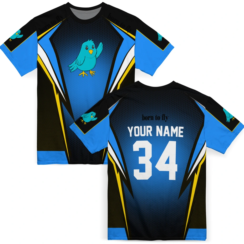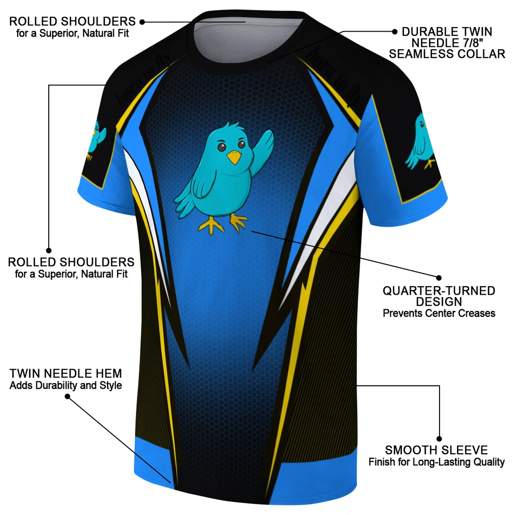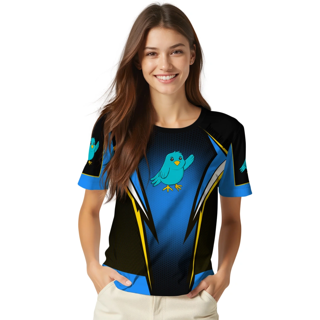Bird Logo 3D Tshirt – Custom Bold Symmetry Motif Blue Black