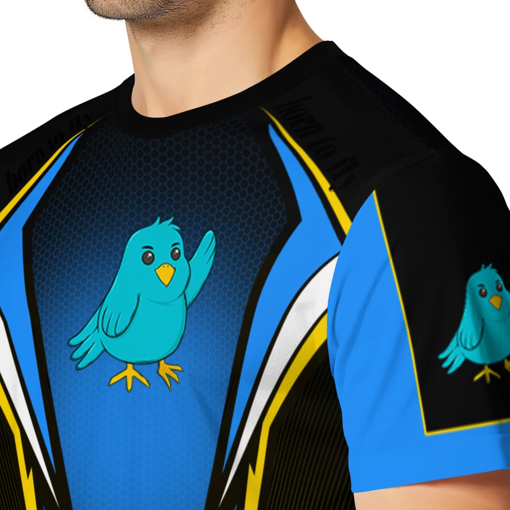 Bird Logo 3D Tshirt – Custom Bold Symmetry Motif Blue Black.